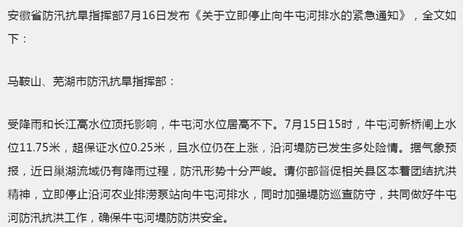 牛屯河是沟通巢湖与长江的一条重要河流,作为巢湖的重要分洪道,由于长期连续降雨和长江水位持续超警导致牛屯河水位持续上涨,截至7月22日已连续超过保证水位12天,防汛形势严峻。